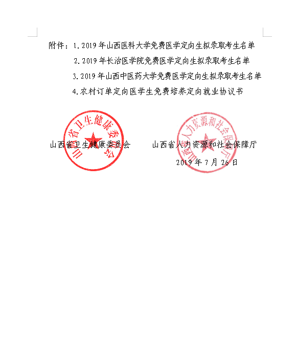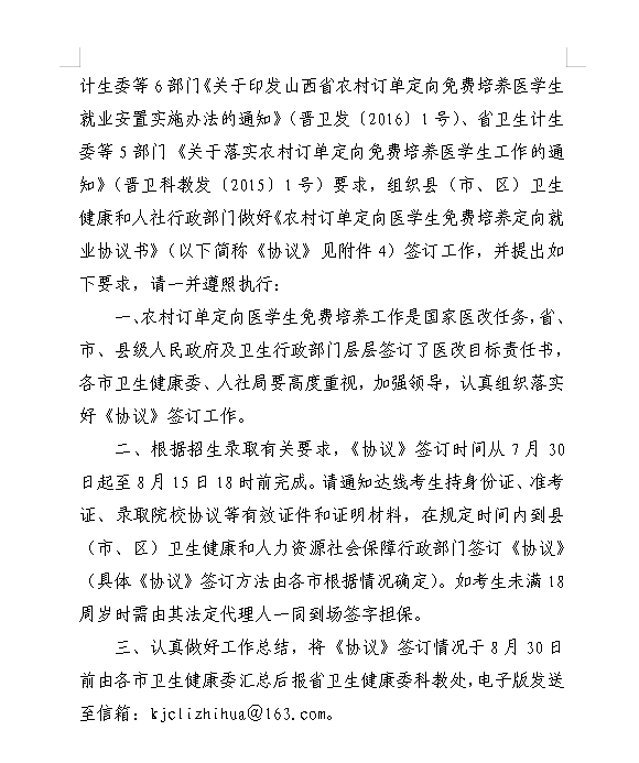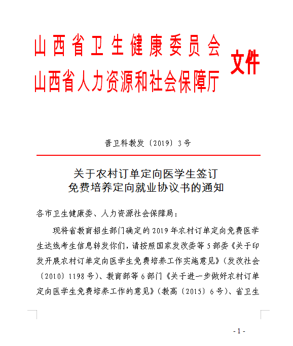 接省卫健委通知,山西省卫健委、人社厅《关于农村订单定向医学生签订免费培养就业协议书的通知》于近日已下发各市县卫生局、人社局,请各免费医学定向录取新生持本人身份证、准考证、与学校培养协议、学校介绍信于7月30日-8月15日到定岗县卫生局、人社局签署《农村订单定向医学生签订免费培养就业协议书》(一式四份),签署完毕后请考生将其中两份就业协议通过邮政EMS快递寄给学校。