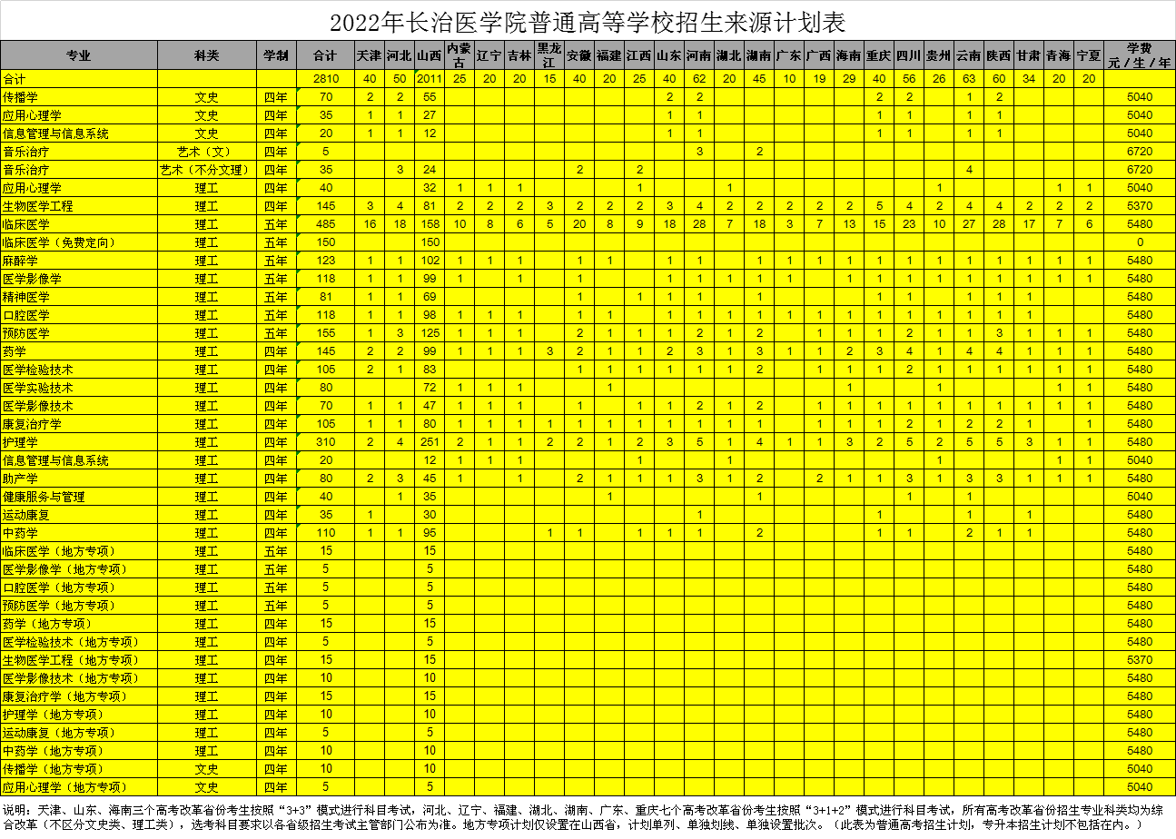 2022年长治医学院普通本科招生计划