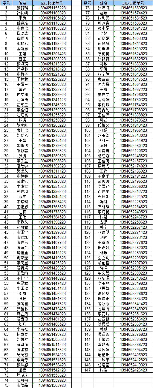 各位2025届免费医学定向毕业生:根据《山西省卫健委关于做好2020级农村订单定向免费培养医学生就业安置工作的通知》相关要求,我校2025届(2020级)免费医学定向毕业生档案于今日通过邮政快递EMS全部寄出,发往免费医学定向生定岗服务地县级卫生行政主管部门。现将快递单号公布如下,请各位毕业生提醒定岗地卫生部门查收,并根据单号跟踪档案投递情况。