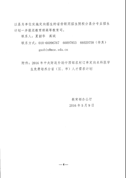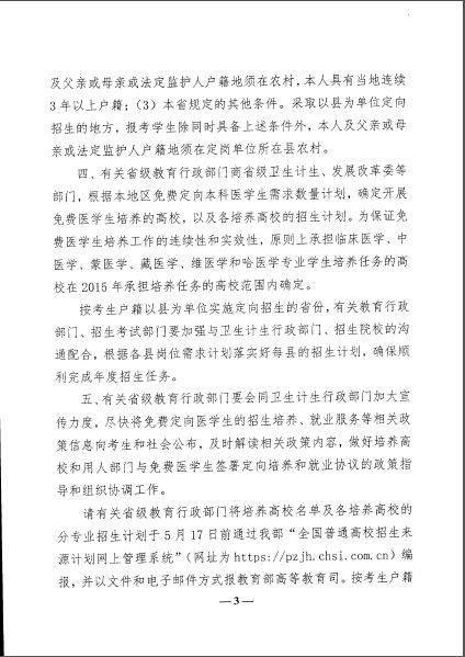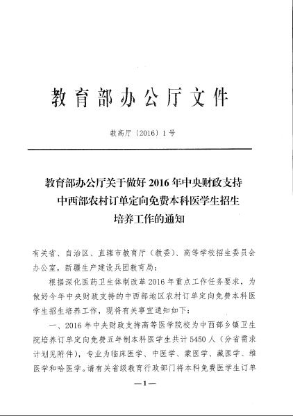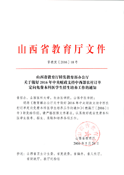 山西省教育厅转发了《教育部办公厅关于做好2016年中央财政支持中西部农村订单定向免费本科医学生招生培养工作的通知》,要求有关单位认真执行文件精神,做好免费本科医学生报考、招生、录取和培养工作。