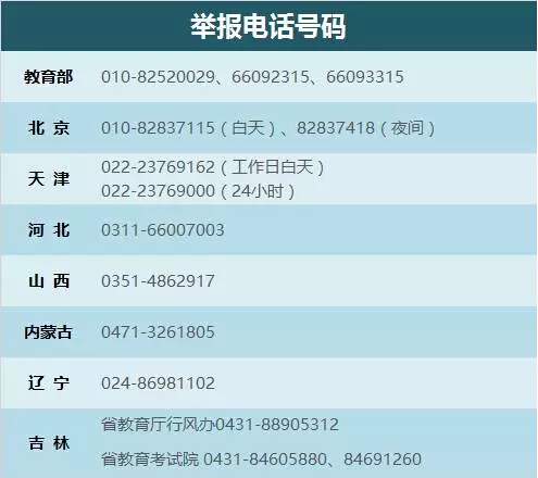 教育部统一部署协调全国31个省(区、市)教育行政部门和招生考试机构开通了2016年高考举报电话。举报电话自公布之日起开通。教育部及各省(区、市)将根据举报线索第一时间核实处理,切实维护高考安全。