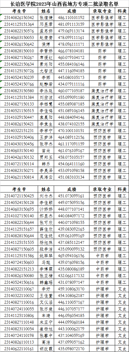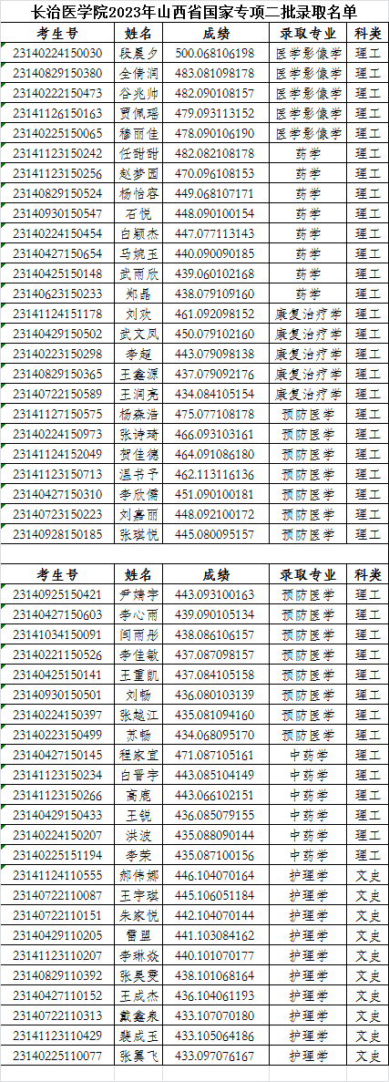 长治医学院2023年山西省国家专项二批、山西省地方专项二批录取名单