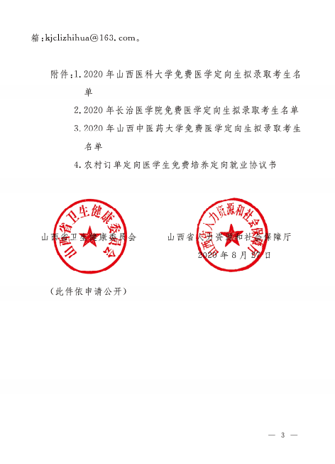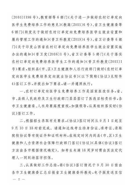 接省卫健委通知,山西省卫健委、人社厅《关于农村订单定向医学生签订免费培养就业协议书的通知》于近日已下发各市县卫生局、人社局,请各免费医学定向录取新生持本人身份证、准考证、与学校培养协议、学校介绍信于9月1日-9月10日到定岗县卫生局、人社局签署《农村订单定向医学生签订免费培养就业协议书》(一式四份),签署完毕后请考生将其中两份就业协议通过邮政EMS快递寄给学校。