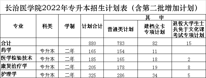7月6日,山西省招生考试管理中心发布《关于扩大2022年普通高校专升本招生计划的公告》,公告指出根据就业工作会议精神和教育部“可根据报到率等情况适当上浮规定规模的10%以内招生计划”的规定,经省教育厅批示,全省增加2022年普通高校专升本招生计划2300人,其中我校增加专升本普通类招生计划20人,各专业增加数量分别为:护理学5人,药学5人,医学检验技术5人,康复治疗学5人。招生计划增加后,我校专升本总计划由之前的860人,增加至880人。(详情见下表)