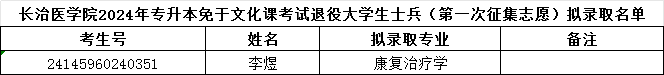 长治医学院2024年专升本免于文化课考试退役大学生士兵(第一次征集志愿)拟录取名单公示