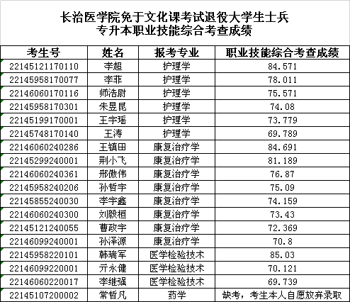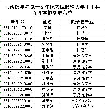 长治医学院2022年专升本免于文化课考试退役大学生士兵拟录取名单公示