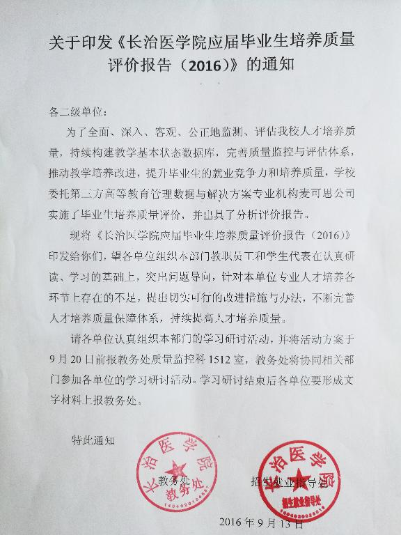 请各学生管理部门至招生就业处领取《长治医学院应届毕业生培养质量评价报告(2016)》纸质版和电子版。