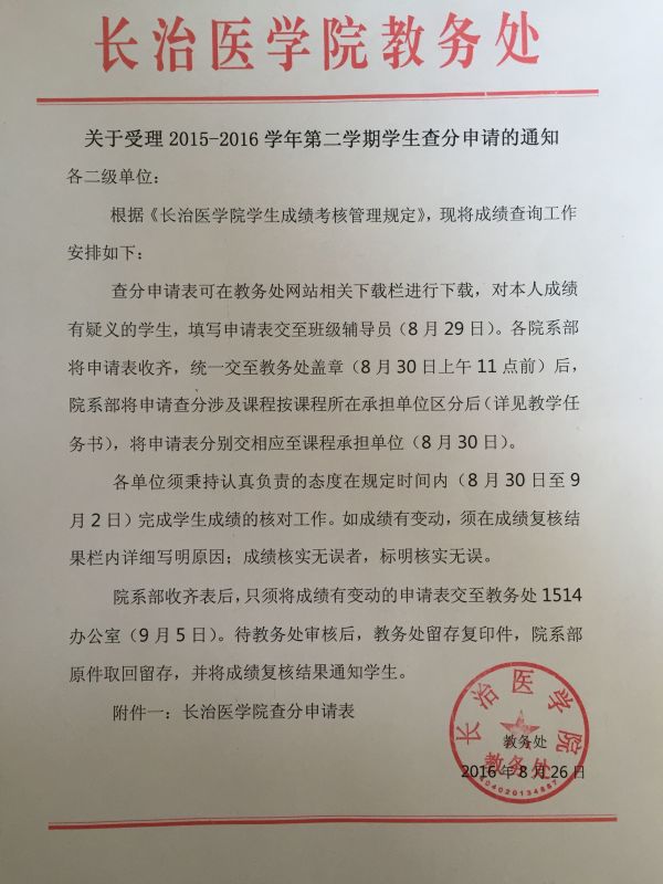 关于受理2015—2016学年第二学期学生查分申请的通知