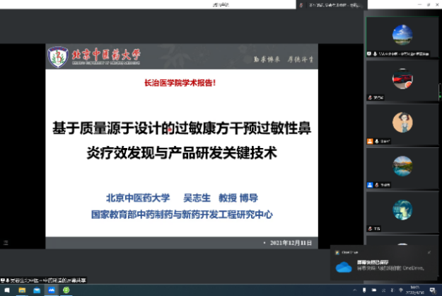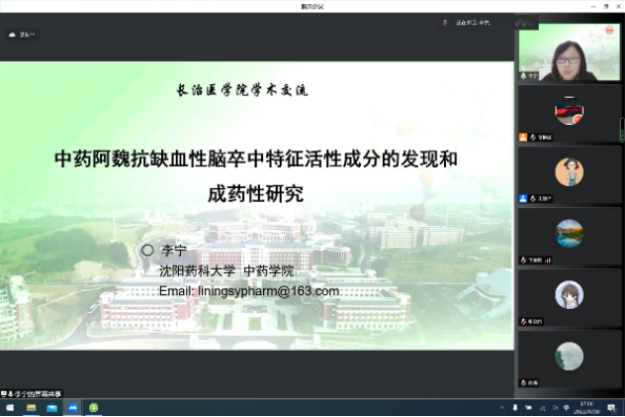 党建环节,与会人员共同观看学习了视频—基层组织换届选举相关内容。学术环节,药学系邀请天津南开医院副院长吴雄志教授、北京中医药大学“优青”项目获得者吴志生研究员、沈阳药科大学中药学院副院长李宁教授分别作了题为“乳腺癌的中医内分泌治疗”“质量源于设计的过敏康方干预过敏性鼻炎疗效发现与产品研发关键技术”“中药阿魏抗缺血性脑卒中特征活性成分的发现和成药性研究”的学术报告。校党委常委、副校长郑金平,药学系党政领导及师生近300人参加了线上学术报告会,会议由系主任宋丽华主持。